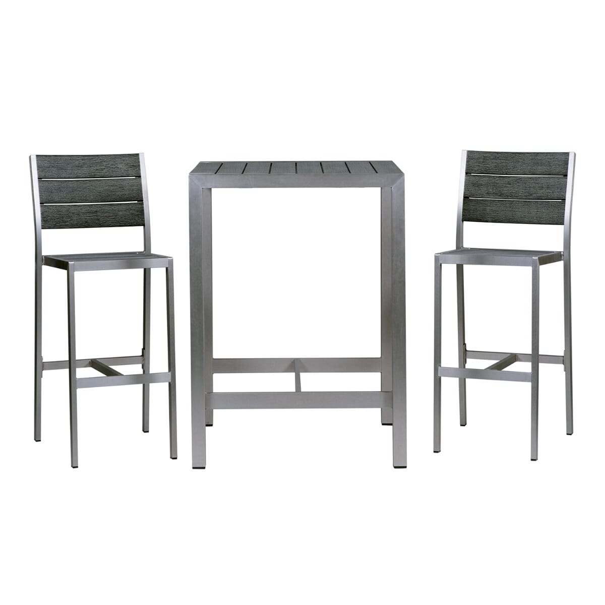This casual yet upscale bar stool is constructed of a lightweight recycled aluminum frame available in a black powder-coated finish for extra durability and scratch resistance or in brushed aluminum. The bar stool features a full seat and back with “teakwood” slats made of a poly material that’s designed to look like reclaimed wood—perfect for creating the ambiance of a waterside setting. This bar stool comes in two color combinations: brushed silver frame with brushed pewter slats that resemble driftwood and black with brushed brown slats. Hard-wearing, reinforced legs feature feet capped with nylon glides to protect both furniture and floor. This commercial bar stool has a matching chair, and the product line is well suited to a variety of outdoor bars and restaurants. Available with or without arms. Light assembly required.