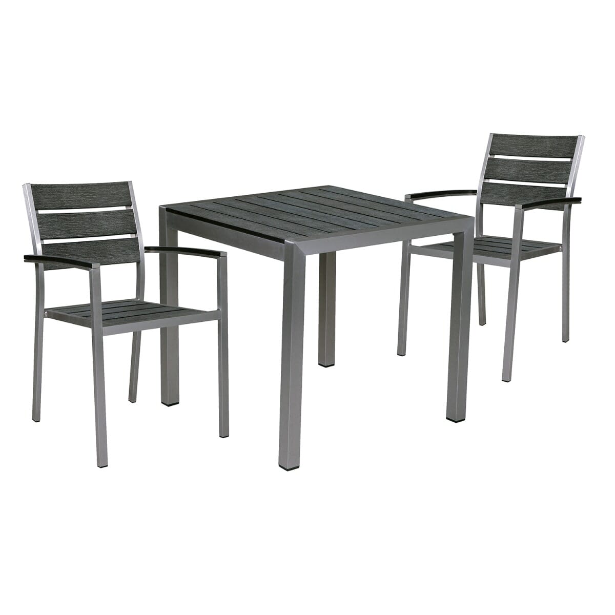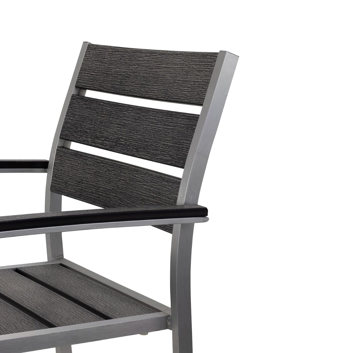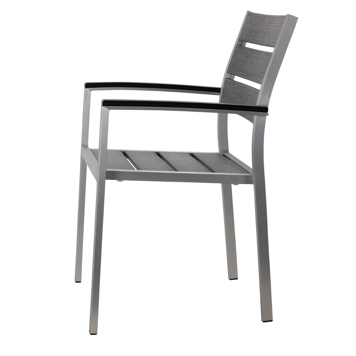 This casual yet upscale chair with arms is constructed of a lightweight recycled aluminum frame. The chair features a full seat and back with “teakwood” slats made of a poly material that’s designed to look like reclaimed wood — perfect for creating the ambiance of a waterside setting. This chair, pictured in pewter, is weather-resistant, combining the beauty of teak wood and the durability of aluminum. Sturdy legs have feet capped with nylon glides to protect both furniture and floor. This chair is stackable and arrives fully assembled.