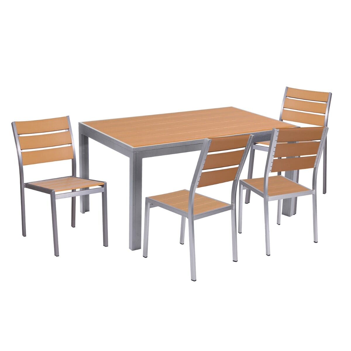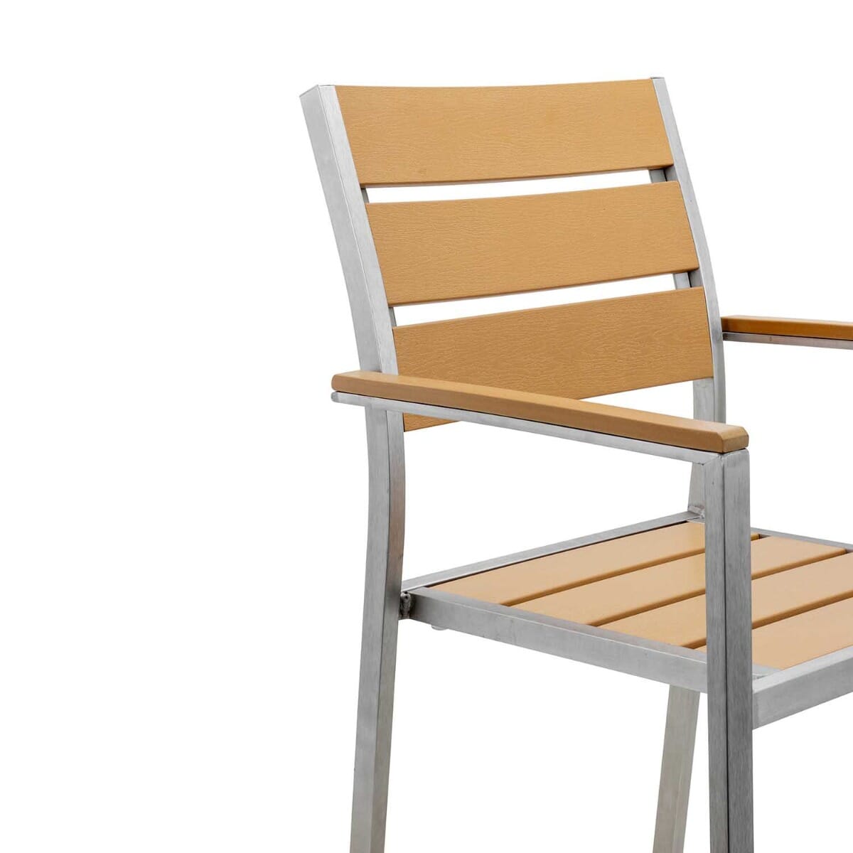 This casual yet upscale chair with arms is constructed of a lightweight recycled aluminum frame. The chair features a full seat and back with “teakwood” slats made of a poly material that’s designed to look like reclaimed wood — perfect for creating the ambiance of a waterside setting. This chair, pictured in Tan, is weather-resistant, combining the beauty of teak wood and the durability of aluminum. Sturdy legs have feet capped with nylon glides to protect both furniture and floor. Arrives fully assembled.