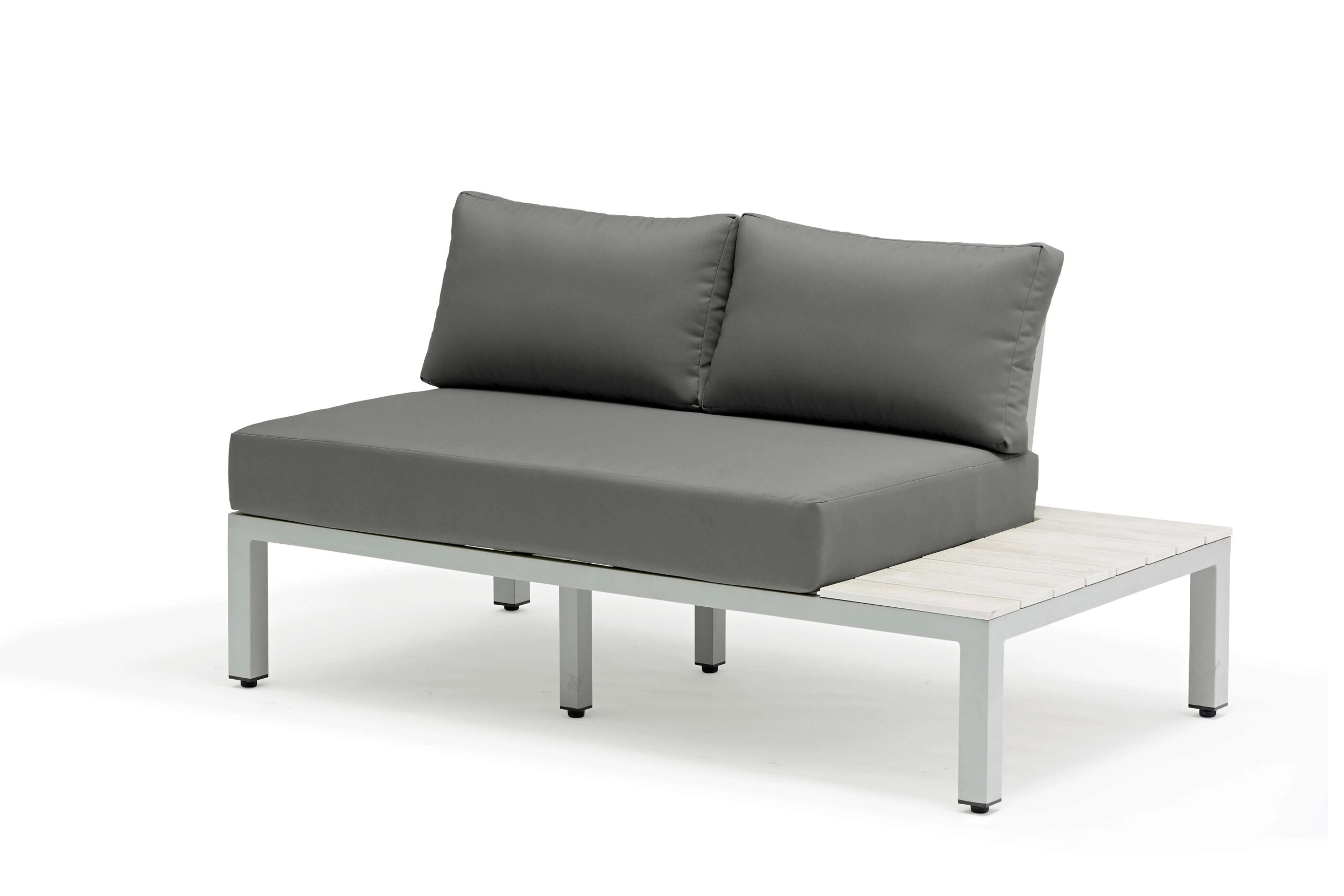 This double sectional is part of our larger Miami Modular Outdoor Set. It features a beautiful light gray aluminum frame with white-wash synthetic wood trims to bring a comfortable yet elegant atmosphere to your indoor and outdoor areas. The foam cushions can be upholstered in more than twenty different fabrics from our Rain or Shine Collection. Combine this sectional with other pieces in the set for different configuration and design options.