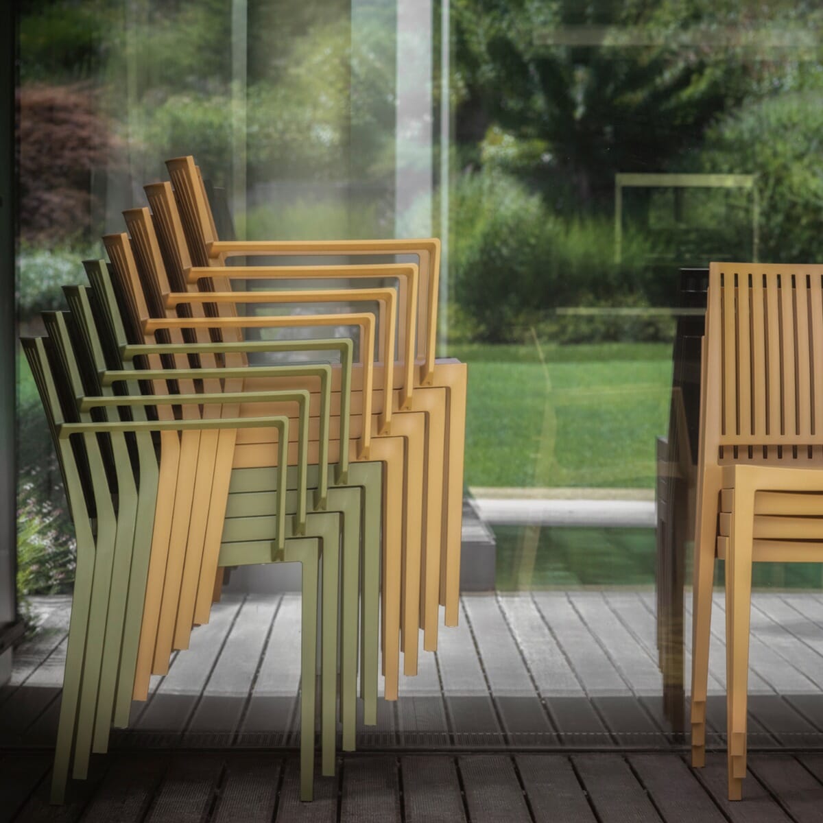 This resin indoor/outdoor patio chair, pictured in black, can be used both indoor and outdoor. This chair is conveniently stackable, UV and scratch-resistant, as well as maintenance-free. The frame is molded in one piece with no joints to make a very strong and durable final product designed for commercial use. The back features an open striped design that adds a unique design detail to your space. The resin material is 100% recyclable. It arrives as pictured and ready to be used.