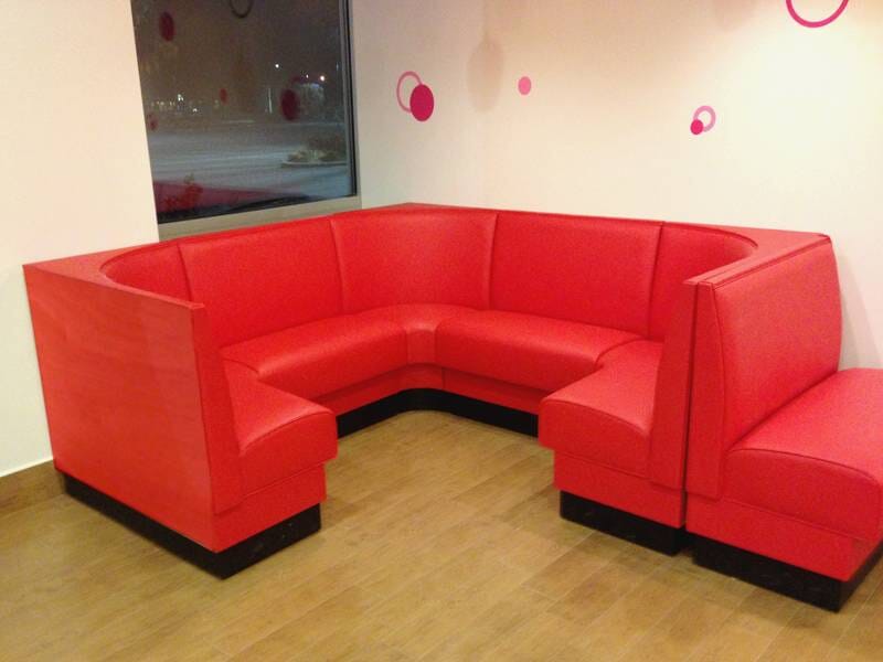 The Standard Style Booth is available with coordinating vinyls and fabrics of your choice. Also available in 2 siders, single seaters – single and 2 siders, circle seating or wall bench. Custom sizes and designs available.