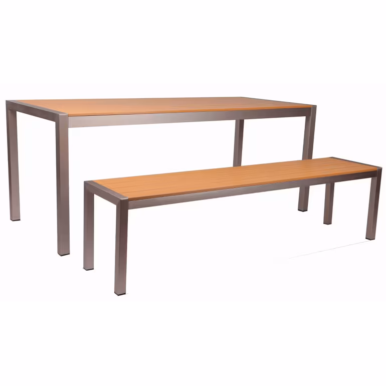 This casual bench seat is constructed from aluminum while the teak slats are made from a poly material. This bench comes in two available colors Tan and Black to suit your needs. Light assembly required!